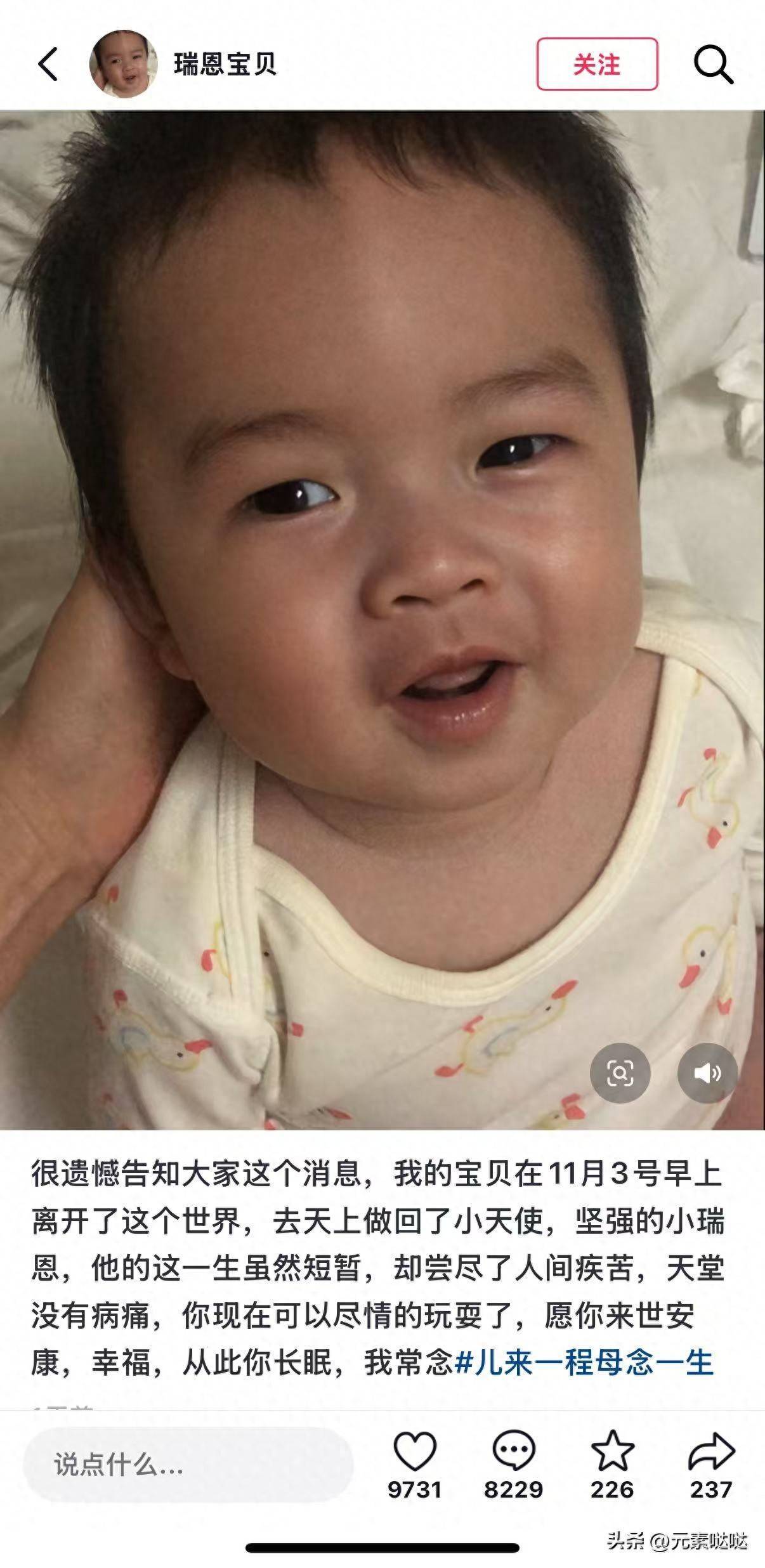 瑞恩的妈妈是一位97年出生的单亲母亲,她在社交平台发文:“我的宝贝去天上做回了小天使”,证实了孩子去世的消息,过去三年里,她一直在平台上用短视频记录照顾瑞恩的日常,积累了13万粉丝。